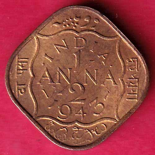 BRITISH INDIA 1943 GEORGE VI 1/2 ANNA RARE COIN – F4333