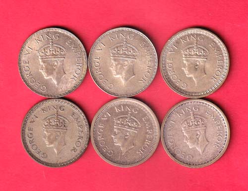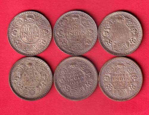British India 6 coins set 1940 ,1941,1942, 1943,1944,1945 one rupee silver coins –FC8428