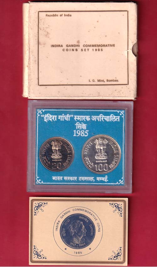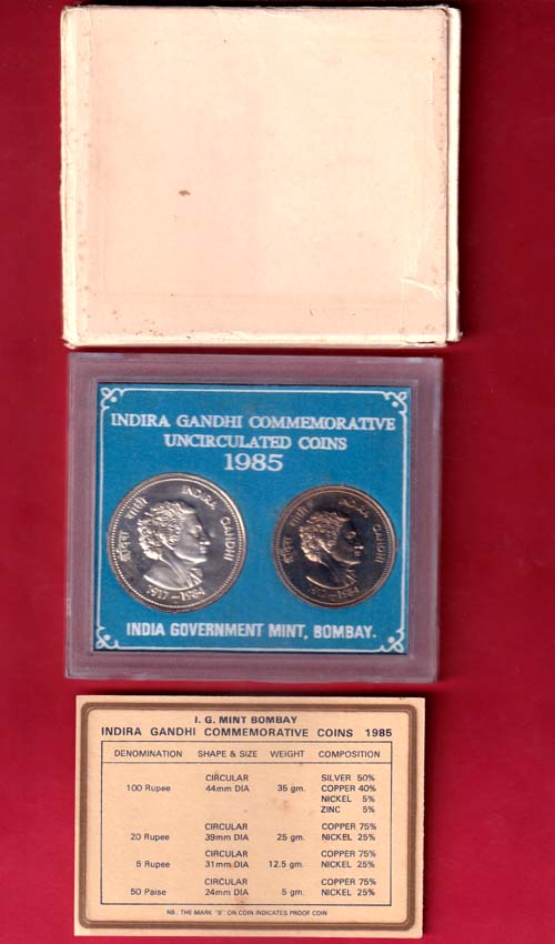 Indira Gandhi Commemorative Coin Set – 1985, issued by the India Government Mint, Bombay (now Mumbai Mint) to honor India’s former Prime Minister Indira Gandhi (1917–1984).– FC6640