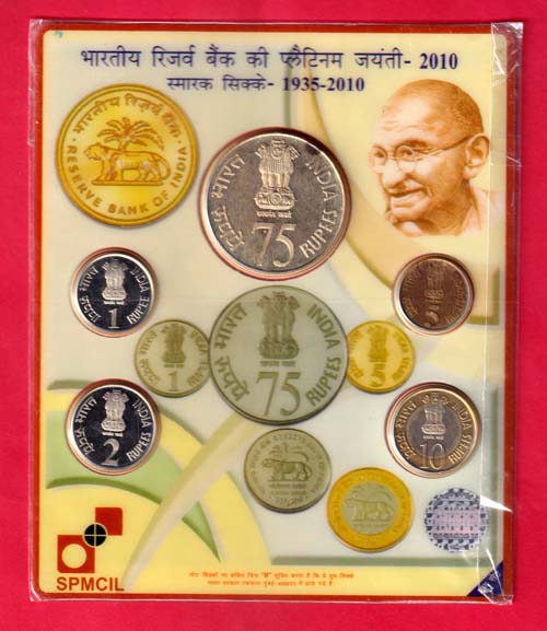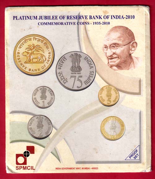 Platinum Jubilee Commemorative Coin Set of the Reserve Bank of India (RBI), issued in 2010 by the India Government Mint, Mumbai (SPMCIL) to mark 75 years of the RBI (1935–2010).– FC6639